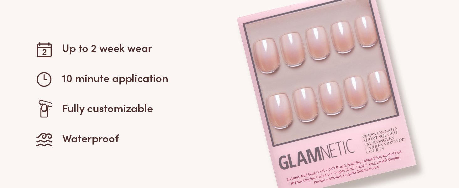 1.Brush a thin layer of glue onto your natural nails with the Glamnetic Brush-On Nail Glue applicator.